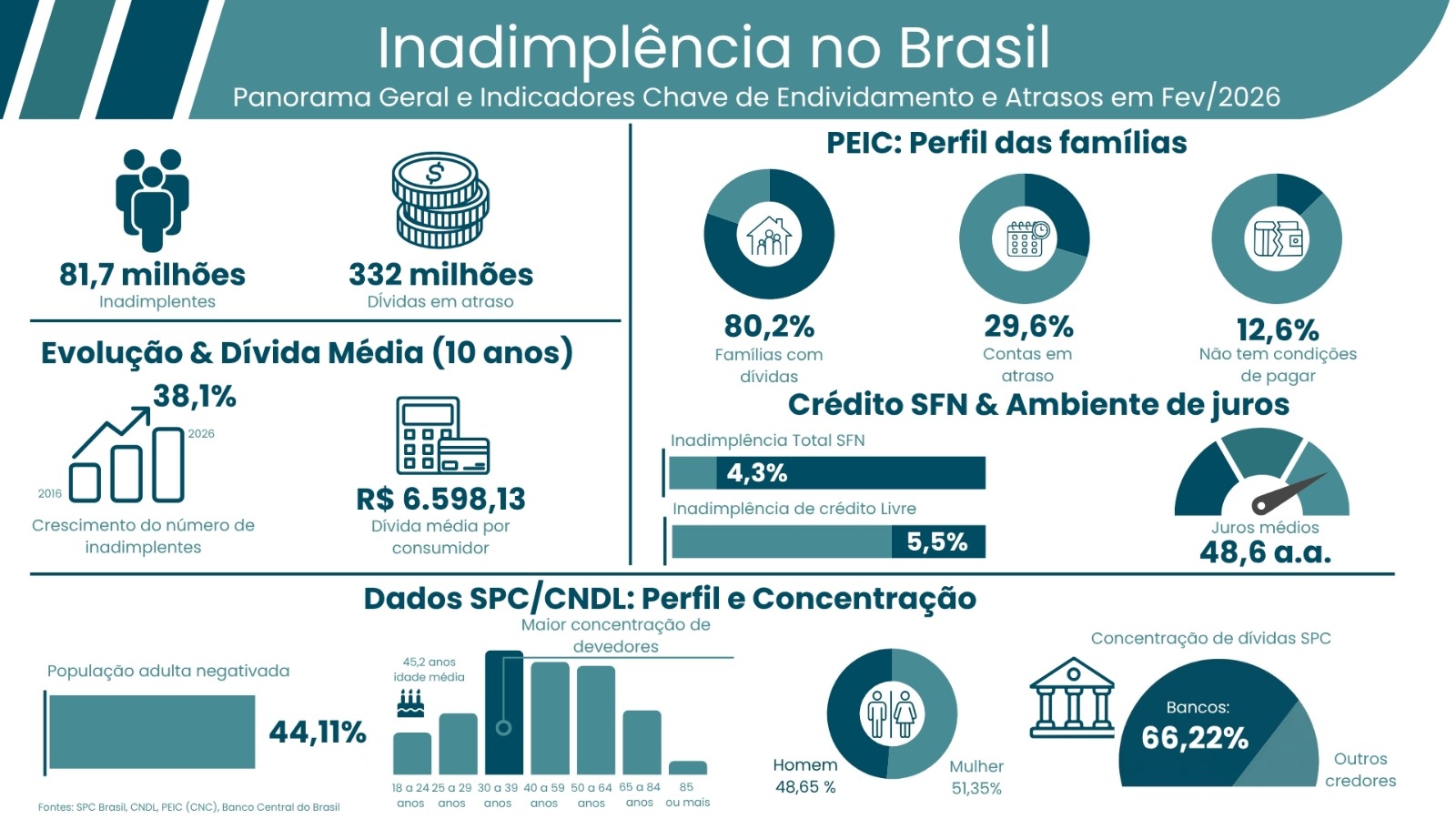 Os dados de inadimplência ajudam a dimensionar o impacto desse cenário. De acordo com a Serasa, cerca de 81,7 milhões de brasileiros estão com contas em atraso, somando dívidas que chegam a R$ 332 bilhões. Nos últimos 10 anos, o número de famílias inadimplentes cresceu 38,1%, com uma média de R$ 6.598,13 em débitos por consumidor.